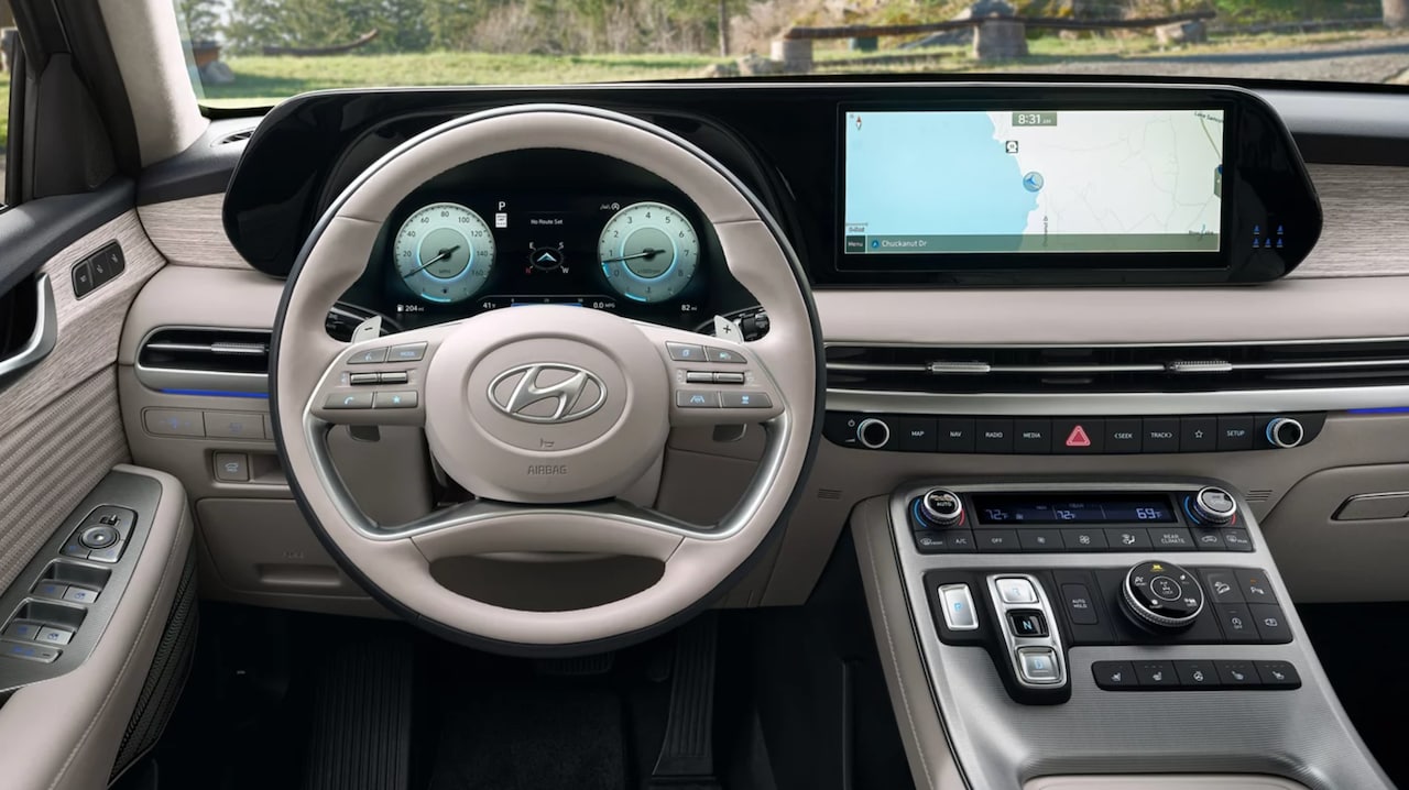 The 2024 Hyundai Palisade is packed with advanced features that cater to the needs of modern drivers. Its center is a 12.3-inch touchscreen. Apple CarPlay and Android Auto seamlessly integrate with the system so that you can stay connected on the go. Bluetooth connectivity ensures a hands-free and effortless experience while driving. The Palisade's tech prowess extends to enhance comfort, offering Rear Seat Quiet Mode and multiple trims with upgraded Harman Kardon sound systems. You can choose from cloth seats, synthetic leather, and total leather seats, with heated and ventilated options available for the first and second-row seats. Additionally, the driver's seat has a memory system, and the third-row seats are heated, making it a customizable and luxurious driving environment. Hands-free smart lift gates make accessing the Palisade's spacious interior a breeze, adding a touch of convenience.