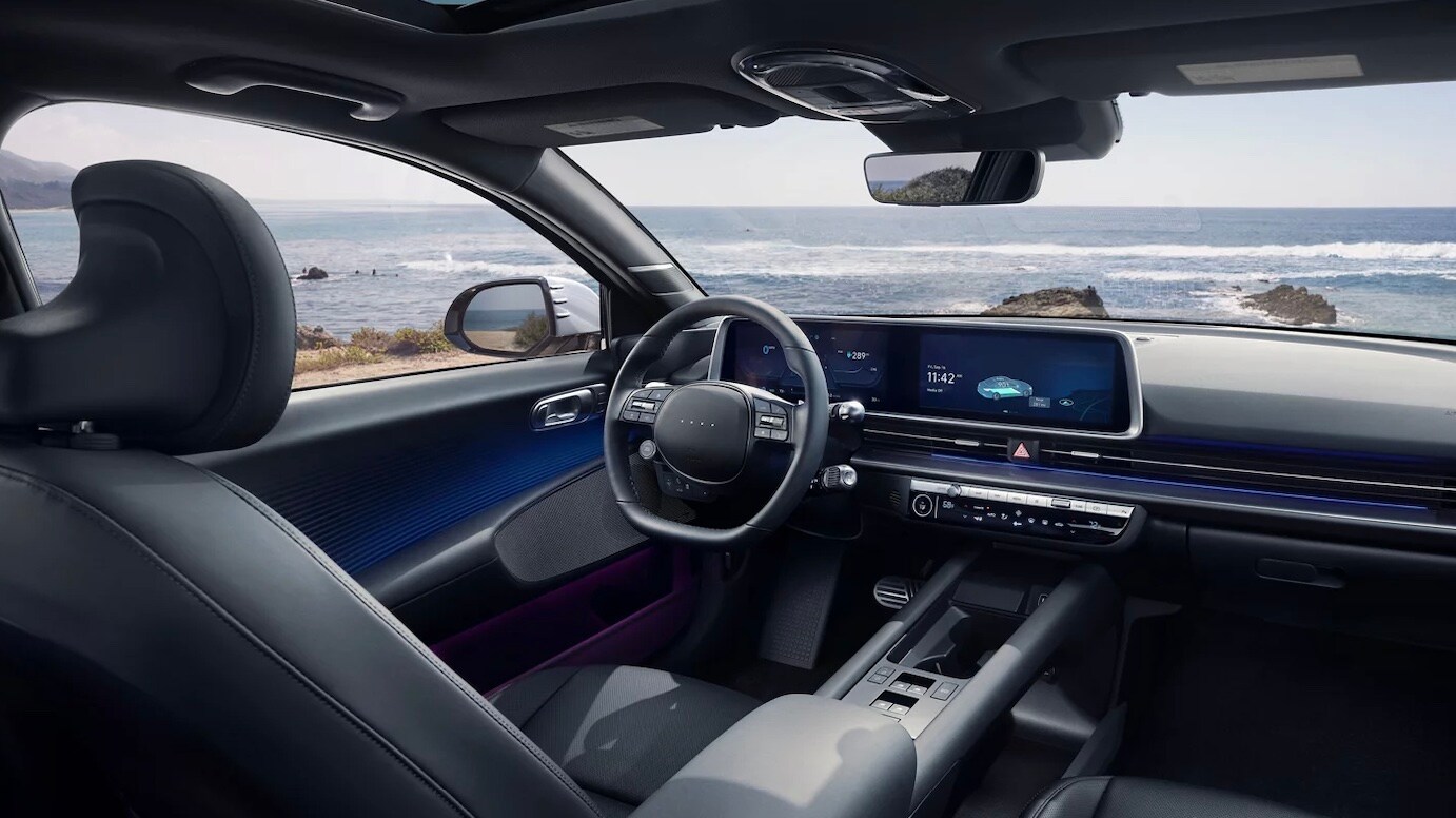Inside, the Ioniq 6 offers a modern and spacious cabin featuring dual 12.3-inch displays for the digital instrument cluster and infotainment system. Standard features include Apple CarPlay®, Android Auto™, and over-the-air (OTA) software update capability. The interior utilizes sustainable materials, such as recycled PET fabrics and bio-based leather alternatives, aligning with Hyundai's commitment to eco-friendly design.