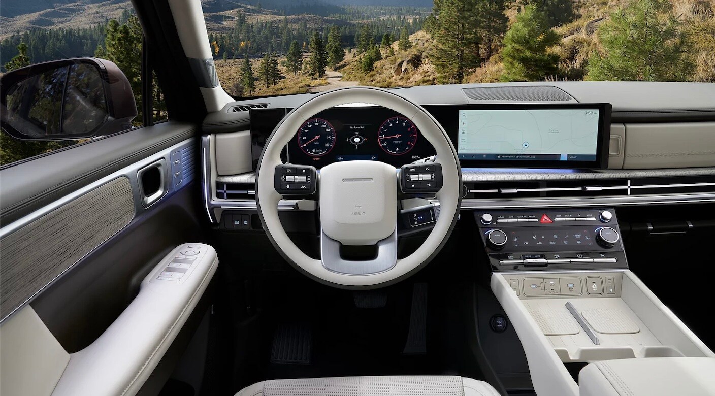 The Santa Fe also introduces innovative storage solutions and a newly available curved display that enhances the cabin's modern feel.