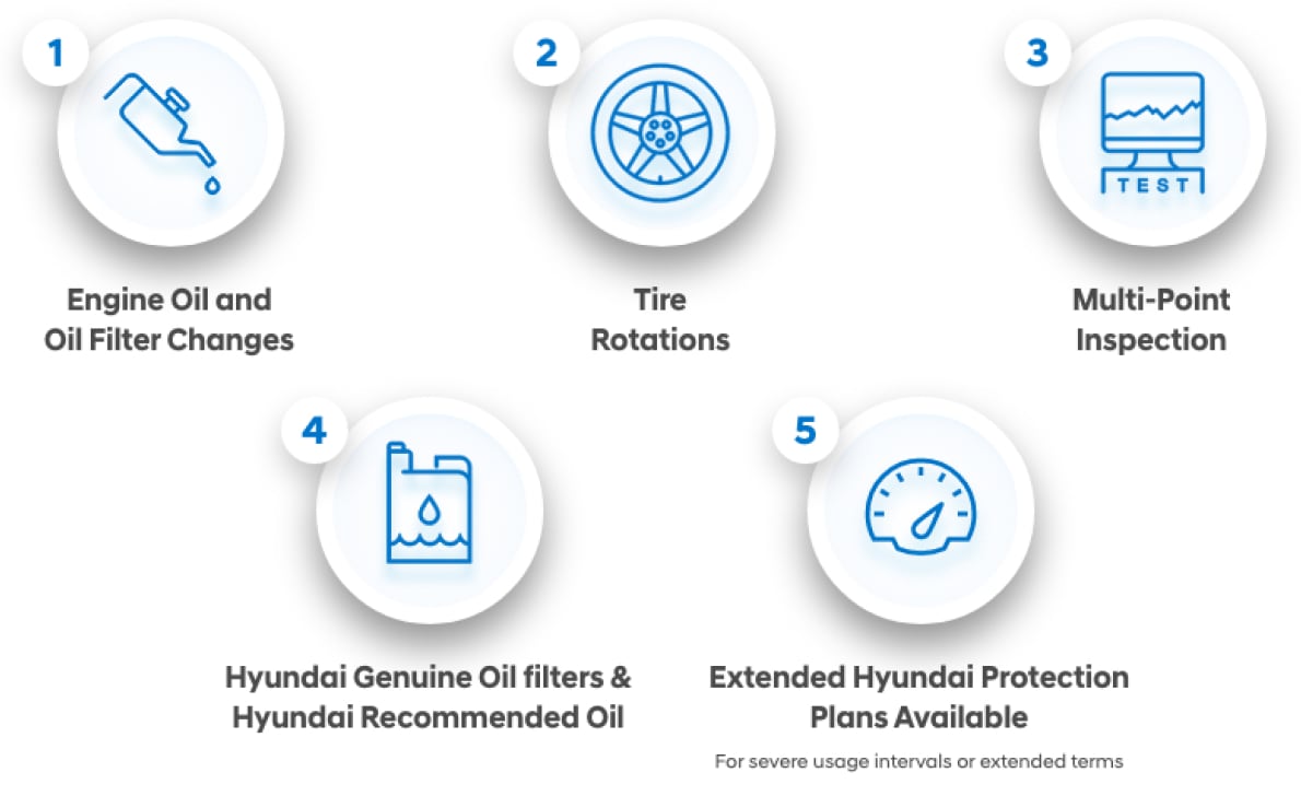 Keeping your new Hyundai running at its best requires regular care and maintenance. We encourage new owners to stay on top of it with Hyundai Complimentary Maintenance. Hyundai has you covered for normal, factory scheduled maintenance intervals for 3 years or 36,000 miles (whichever comes first) on new 2025 model year Hyundai vehicles. More frequent maintenance due to severe driving or conditions is excluded. Benefits include:.